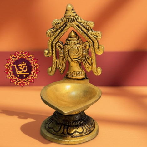 This masterfully handcrafted brass lamp features the sacred Sangu (Conch) and Chakra (Sudarshana Wheel), the eternal symbols of Lord Vishnu. Finished in a premium antique bronze patina, it is designed to dispel negative energy and bring a temple-like sanctity to your home mandir. A perfect Vastu-friendly addition for your 2026 spiritual decor or a prestigious gift for housewarmings and weddings.